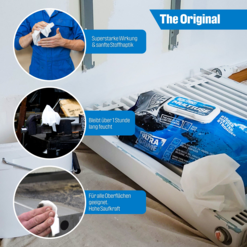 kenmerken:papierkwaliteit stof. van weefsel in wit. Blijft tot een uur vochtig, zelfs wanneer het deksel open wordt gelaten of een doek wordt hergebruikt. Uitvoering absorberend, water- en scheurvast, uitwasbaar en herbruikbaar. Effectief tegen hardnekkig vuil zoals olie, metaalstof, verf en lijm. doek alcoholvrij en verrijkt met vitamine E en aloë-extract. Hiermee is de veiligheid van handen en alle oppervlakken gegarandeerd. Het product wordt in een milieuvriendelijke en recyclebare verpakking geleverd.