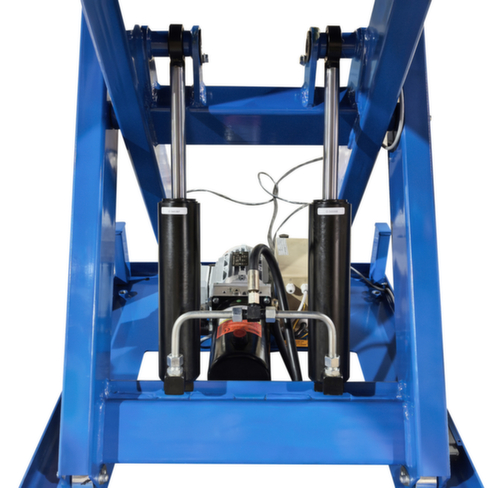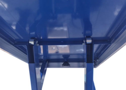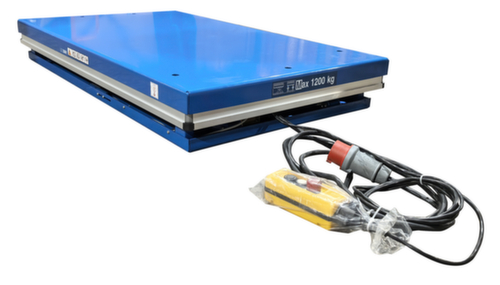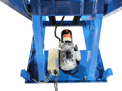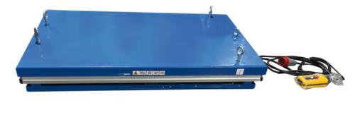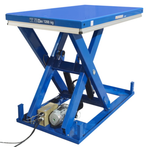 van staal met slag- en krasvaste poedercoating in RAL5017 verkeersblauw. hefuitvoering elektrisch met handtoets voor heffen en neerlaten. enkelvoudige schaar van staal met slag- en krasvaste poedercoating in RAL5017 verkeersblauw. torsiebestendige staalconstructie. platform met bevestigingsgaten in het oppervlak. Indien nodig kunnen de meegeleverde hijsogen hierin worden geschroefd om de heftafel veilig met hijsbanden te vervoeren. kabel 3,5 m lang. Met 400 V/50 Hz. beschermingsklasse IP54: stofafzetting aan de binnenkant, spatwater alle richtingen. isolatieklasse F.