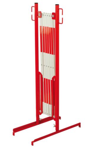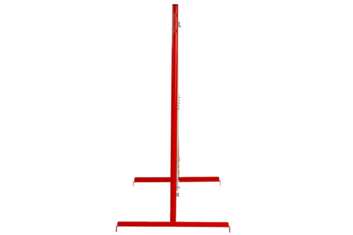 De belangrijkste afmetingen van het UDOBÄR afzetsysteem in één oogopslag:paal van staal in rood. voet van plaatstaal in rood. van stalen buis in rood/wit. onderbouw voeten. Voor opstelling op de vloer.