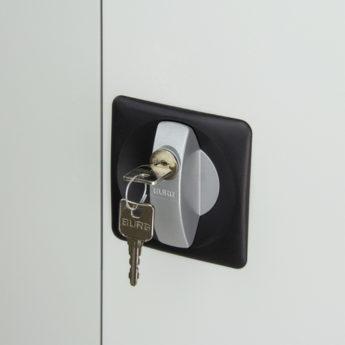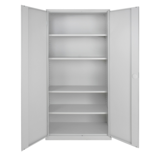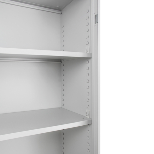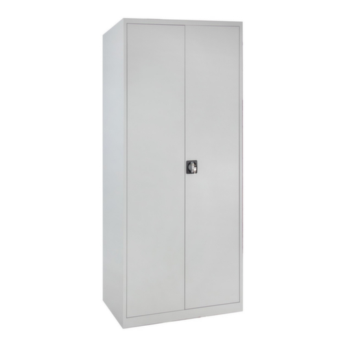 de belangrijkste maten van de universele kast in één oogopslag:Van staal. Zeer flexibele binneninrichting door verstelbare vakhoogte per 25 mm. uitgerust met legborden. Via de dubbele openslaande deur is de kast zeer goed toegankelijk. De inliggende deuren sluiten vlak aan op de romp en hebben dus geen uitstekende randen waar men zich aan kan stoten of waar zich stof kan ophopen. Elke deur is standaard uitgerust met geluiddempende rubberen buffers, zodat de deur ook bij hard sluiten niet dichtslaat. De buffers zorgen voor minder lawaai en beschermen de kast bovendien tegen beschadigen. afsluitbaar met duwstangsluiting met cilinderslot. De 2-punts veiligheidsgrendel zorgt voor veel stabiliteit en een doeltreffende inbraakbeveiliging.