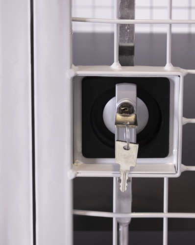 3 wanden (draadgaas), 1 dubbele openslaande deur, 4 legborden
