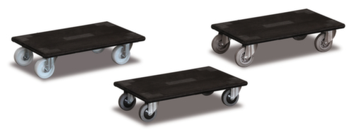 "description": "draagverm. 500kg, laadvl. LxB 600x350mm, laad H 145mm, platform gesloten, Multiplexplaat, met rubber laag, zwart, 4zwenkwielen, kunststof-banden",