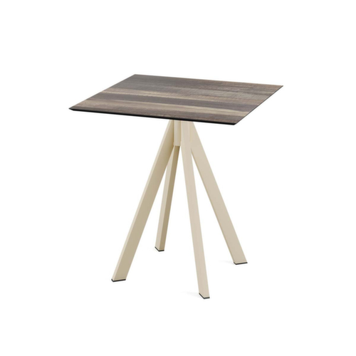 4-voetonderstel van staal in zandkleuren. blad van HPL in Tropical Wood.