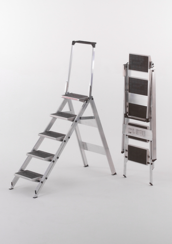 "longDescription": "<h2>Inklapbaar opstapje</h2><strong>comfortabel en veilig voor elke toepassing</strong><br><ul><li>Extra gemakkelijke beklimming - kan worden beklommen als een trap dankzij comfortabele hellingshoek en extra brede treden</li><li>Stabiel - bar eindigt met anti-slip ladder voeten</li><li>Licht en robuust - gemaakt van aluminium</li></ul> <br><h3>Je hebt de keuze:</h3><ul><li>Nog meer veiligheid - met inklapbare veiligheidsbeugel inclusief opbergbakje en emmerhaak aan beide zijden</li><li>Treden met anti-slip plastic bekleding of gemaakt van traanplaat</li></ul><br>De Little Jumbo trapladder biedt een hoge mate van stabiliteit dankzij het conische, brede ontwerp. De stevige constructie draagt het GS-keurmerk en heeft een garantie van 5 jaar. <br><br>Kies uit verschillende hoogtes, aantal treden, tredeoppervlak en veiligheidsbeugel. Het tredeoppervlak is gemaakt van traanplaat of met een rubberen opleg. Beide zorgen voor een veilige en stabiele standplaats op de ladder. Hij kan aan één kant worden beklommen en kan dus worden bewandeld als een trap. Deze ladder kan met of zonder veiligheidsbeugel worden besteld, waarbij de beugel altijd is inbegrepen vanaf een versie met drie treden. Een grote opbergbak voor gereedschap of dergelijke en emmerhaken aan beide zijden zijn erin geïntegreerd, zodat alles voor het werken met deze vouwladder direct binnen handbereik is.<br><br>Dankzij zijn aluminium karakter is hij heel handig, want hij weegt niet veel. Niettemin is de ladder belastbaar tot 150 kg. In de uiteinden van de ladderbomen zijn grote, geribbelde kunststof schoenen ingebouwd, die zelfs op natte vloeren een veilige stand waarborgen.<br><br><strong>Kwaliteitskenmerken!</strong><br><ul><li>kwaliteitsgarantie conform DIN EN 14183</li><li>VDL</li></ul>",