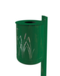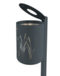 voor montage met palen van vierkante buis. om in te betonneren. met dekselplaat. inworpopening 150 mm diameter. wandconstructie geperforeerd met aantrekkelijk rietdesign. romp van staal thermisch verzinkt en voorzien van slag- en krasvaste poedercoating. afsluitbaar met driekantslot. vloerconstructie geperforeerd voor directe waterafvoer.
