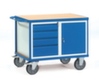 "longDescription": "<h2>Tafeltjes- en kastentrolleys</h2><strong>Draagvermogen tot 600 kg</strong><br><ul><li>Gelaste stalen constructie, poedercoating, trolley- en kabinetsfront RAL 5007 grijs briljant, kabinetsbehuizing lichtgrijs RAL 7035</li><li>Werkblad van 19 mm dik sandwichpaneel, met of zonder 80 mm hoge afrolrand</li><li>Kast met 1 vaste en 2 verstelbare legplanken en scharnierende deur, laden met glijdoppen</li><li>Naar keuze met 4 of 6 laden</li><li>2 Zwenk- en 2 bokwielen van TPE, zwenkwielen met rem, naaf met groefkogellager</li></ul><br>De tafel- en kastentrolley met laden van fetra biedt de lading bescherming tijdens het transport. Een robuuste en stabiele constructie wordt bij deze werkplaatswagen gegarandeerd door het gebruik van staal - het oppervlak heeft een poedercoating en is daardoor zeer ongevoelig, alsmede stoot- en krasbestendig. Een platform zorgt voor gemakkelijk opbergen en wegnemen. Hij heeft 2 zwenkwielen en 2 bokwielen (zwenkwielen met rem) met TPE-banden. <br><ul><li>10 jaar garantie </li><li>Remmen genormaliseerd volgens EN 1757-3</li></ul>",