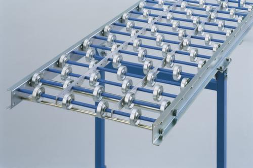 "longDescription": "<h2>Stalen wieltjesbaan - balie-element</h2><strong>Bocht 90°</strong><br><ul><li>voor het transport van stukgoederen met behulp van zwaartekracht (verval)</li><li>de gewenste helling (al naargelang de vorm en het gewicht van het transportgoed is deze ca. 2-5%) wordt met in hoogte verstelbare steunen bereikt</li><li>kan eenvoudig en snel worden gebouwd</li><li>individueel uit te breiden</li></ul><br><h3>Frame:</h3><ul><li>van verzinkte stalen U-profielen 20/70/20 x 2 mm </li><li>met ingeschroefde dwarstraversen</li><li>de assen zijn extra met middenschoren verstevigd</li><li>framehoogte 70 mm</li><li>totale bouwhoogte 80 mm</li><li>bochten met binnenradius 800 mm</li></ul><br><h3>Assen en wieltjes:</h3><ul><li>assen van verzinkt staal, met kogelgelagerde verzinkte stalen wieltjes</li><li>roldiameter 48 mm</li></ul><br><h3>Let op:</h3><ul><li>het transportgoed moet een vormstabiele en gladde bodem zonder kanten, randen of draadgaas hebben</li><li>het moet op minstens 3 rolassen rusten</li><li>de kleinste breedte mag niet minder dan 200 mm zijn.</li></ul><br><h3>Accessoires (apart bestellen):</h3><ul><li>eindaanslag</li><li>zijdelingse geleiding (vanaf 2 m transporthoogte voorgeschreven)</li><li>dubbele standaardsteun voor vaste montage</li></ul><br>Planningshulp:<br>Breedte transportgoed - baanbreedte<br><ul><li>de grootste breedte van het transportgoed bepaalt de baanbreedte</li><li>de bouwvorm garandeert een probleemloos transport ook bij zijdelings uitsteken van het transportgoed van telkens 100 mm</li><li>het is aan te bevelen om de baanbreedte niet kleiner dan de breedte van het transportgoed te kiezen</li><li>kleinste breedte transportgoed 200 mm</li></ul>Lengte transportgoed - asafstand<br><ul><li>de kleinste lengte van het transportgoed bepaalt de asafstand</li><li>het transportgoed moet altijd minstens op 3 rolassen rusten</li><li>kleinste lengte transportgoed: 3 = vereiste asafstand</li><li>max. lengte transportgoed in bochten 1000 mm, op rechte stukken willekeurig</li></ul>Gewicht transportgoed - steunafstand<br><ul><li>het gewicht van het transportgoed bepaalt de steunafstand en dus ook het aantal steunen</li><li>de steunafstand mag niet meer dan 2 m zijn.</li><li>statisch draagvermogen tot 200 kg (stalen wieltjes) per meter baanlengte bij 1 m steunafstand</li></ul>",
