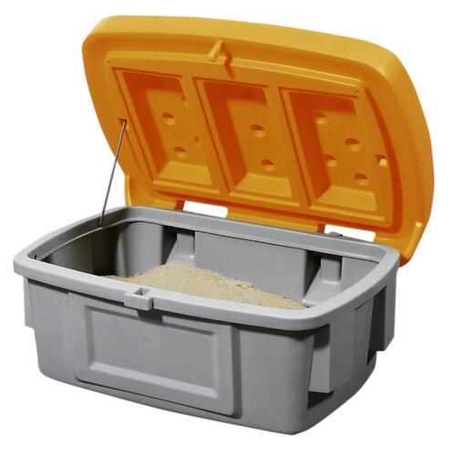 van slagvast polyethyleen. uitgerust met snel en eenvoudig afneembare klapdeksel - zonder gereedschap. Afsluitbaar: dankzij de inhangconstructie aan deksel en romp kan indien gewenst een hangslot worden aangebracht. Zo is bescherming tegen onbevoegde toegang altijd mogelijk. bak grijs, deksel oranje. wanden gesloten - als uitvoering zonder uitneemopening. Hierdoor is de afvalverzamelaar extra robuust. legbord gesloten. Met open deksel in elkaar stapelbaar.