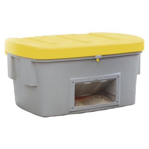 van slagvast polyethyleen. uitgerust met snel en eenvoudig afneembare klapdeksel - zonder gereedschap. Afsluitbaar: dankzij de inhangconstructie aan deksel en romp kan indien gewenst een hangslot worden aangebracht. Zo is bescherming tegen onbevoegde toegang altijd mogelijk. bak grijs, deksel geel. wanden gesloten met praktische uitneemopening. Hierdoor is het materiaal gemakkelijk uitneembaar zonder het deksel te openen. legbord gesloten. Met open deksel in elkaar stapelbaar.