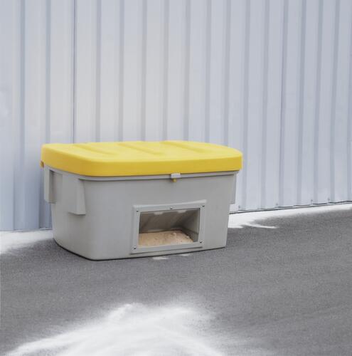 van slagvast polyethyleen. uitgerust met snel en eenvoudig afneembare klapdeksel - zonder gereedschap. Afsluitbaar: dankzij de inhangconstructie aan deksel en romp kan indien gewenst een hangslot worden aangebracht. Zo is bescherming tegen onbevoegde toegang altijd mogelijk. bak grijs, deksel geel. wanden gesloten met praktische uitneemopening. Hierdoor is het materiaal gemakkelijk uitneembaar zonder het deksel te openen. legbord gesloten. Met open deksel in elkaar stapelbaar.Let op! De afbeelding geeft het product zo getrouw mogelijk weer.